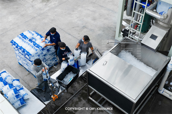Workers efficiently feed 5 kg and 10 kg food-grade plastic bags onto the weighing platform connected to the ice discharge point. The semi-automatic bagging line ensures accurate portioning and quick sealing, while the adjacent cold room maintains -5°C to -10°C to preserve ice quality during storage and distribution.